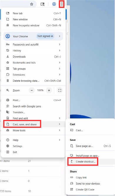 Within the Chrome browser, click on the three dots in the upper right corner, then click “Cast, save, and share”, and “Create Shortcut…”